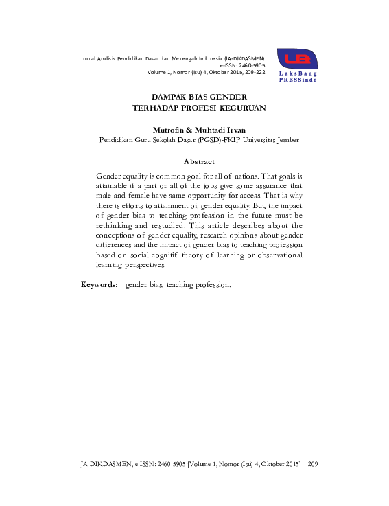 Pdf Dampak Bias Gender Terhadap Profesi Keguruan Mutrofin